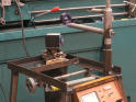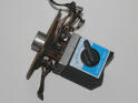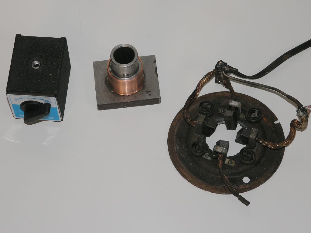 The magnetic base has been bolted to the plate and the brush assembly placed over the copper slip ring.